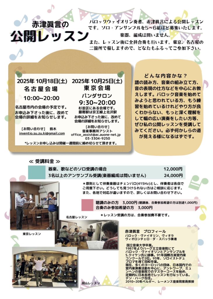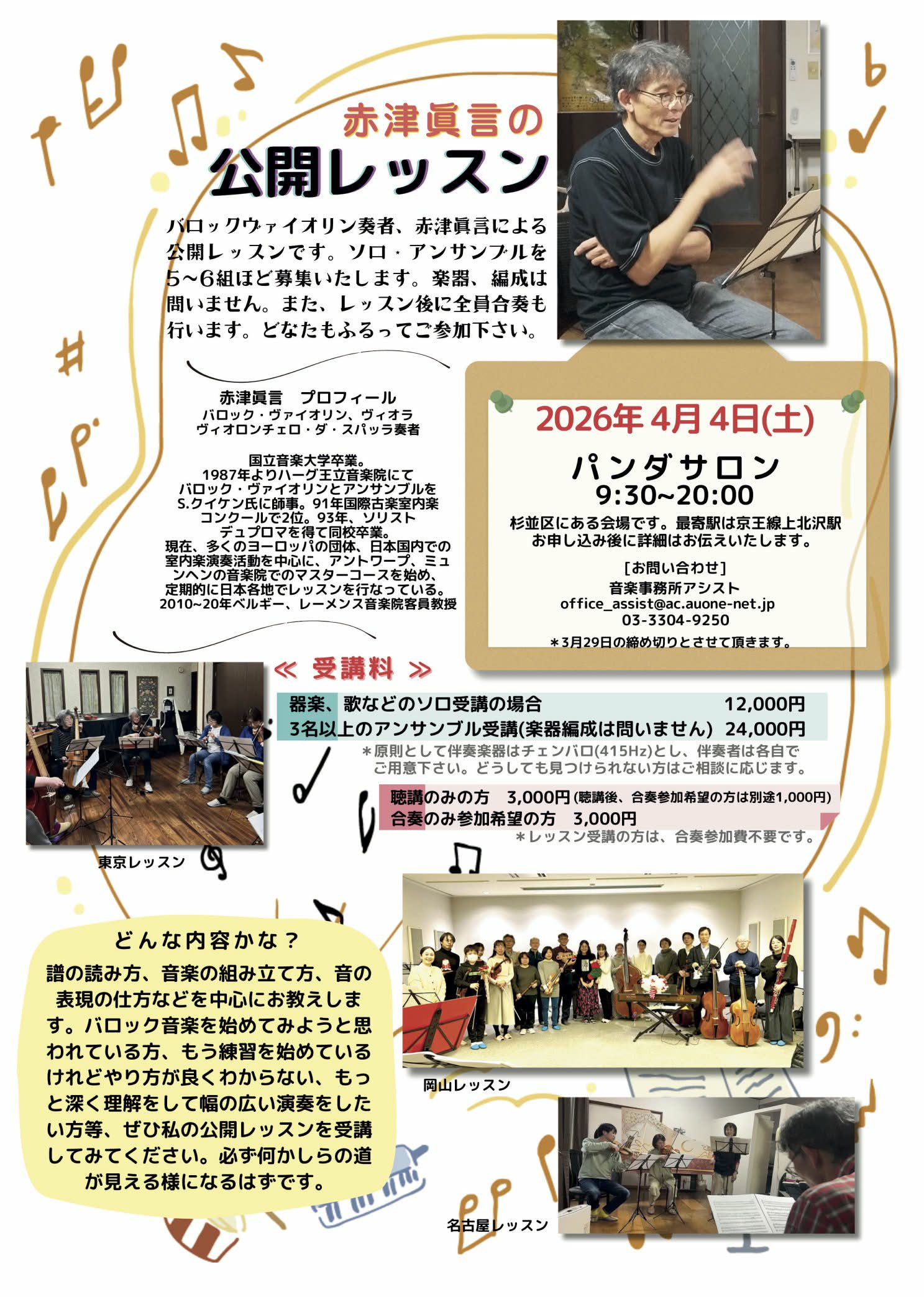 バロックヴァイオリン奏者、赤津眞言による公開レッスンです。ソロ、アンサンブルを 5、6組募集します。